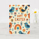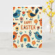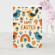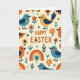 Este cartão de felicitações apresenta a mensagem “FELIZ PÁSCOA” centralizada perto do topo em letras laranjas quentes, com um pequeno coração usado como detalhe de ponto, dando à redação um toque suave e afetuoso. Em um fundo cremoso, pequenos pássaros estilizados se repetem em um padrão organizado, coloridos em azul turquesa, laranja e amarelo dourado com asas azul-escuras e olhos pretos simples. Alguns pássaros usam pequenas marcas de coração no peito, como pequenos tokens compartilhados entre amigos 🐰. Ao seu redor, flores simplificadas em laranja e vermelho sentam-se ao lado de pequenos ramos frondosos, corações espalhados e arcos suaves de arco-íris em tons primários suaves. As formas planas e áreas de cor sólida mantêm tudo organizado e moderno, enquanto os motivos repetidos parecem um coro amigável na página 🐇. O texto permanece claramente separado do padrão, destacando-se no espaço aberto acima dos pássaros e elementos botânicos. Pequenos corações