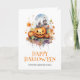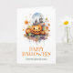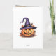 Cartão de Dia das Bruxas, de cor aquosa, com jack-o-lanternas, folhas em queda e mansão assombrada na frente e uma abóbora vestindo um chapéu roxo na parte de trás. Personalize facilmente este belo cartão de Halloween com seu nome familiar, foto e texto.