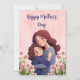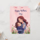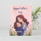 Celebre o Dia das Mães de uma forma calorosa e única com este encantador cartão de felicitações. O design apresenta uma bela ilustração de uma mãe e uma filha num abraço carinhoso, rodeadas por delicadas flores de tulipa rosa e folhas verdes. O cartão inclui o texto elegante e manuscrito "Feliz Dia das Mães" numa adorável cor azul.