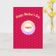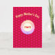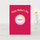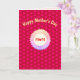Cartão do Dia das Mães com um belo girassol com tons pastel multicoloridos e a palavra MÃE no centro sobre um fundo vermelho com padrão de coração magenta.