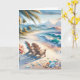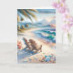 Cartão de Dia de os namorados romântico. O dentro de texto pode ser personalizado. Linda ilustração da aquarela de ondas azuis que caem em uma praia arenosa, flores tropicais, palmeiras com fundo de montanhas e dunas. Um coração desenhado na areia ao lado do bonito vidro do mar.
