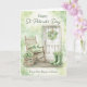 Celebre o Dia de São Patrício com charme sincero e calor de estilo rústico. Este cartão de felicitações em aquarela apresenta um convidativo alpendre de cottage irlandês adornado com uma coroa de trevos, uma cadeira de balanço, botas verdes e folhagens suaves de primavera — uma cena aconchegante que captura o espírito de lar e tradição.