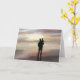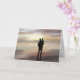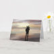 Uma silhueta de um pai segurando seu filho jovem na praia ao pôr do sol. Texto dizendo "Feliz Dia do Pai" dentro do cartão.