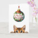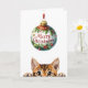 Este Cartão de Natal De Gato Engraçado Adorável, Engraçado, apresenta um Gato de Tabby Misquioso. Acima da cabeça, pendura um Enfeites de natal brilhante que diz, "Feliz Natal". Perfeito para Cat Lovers que apreciam um pequeno aborto de Férias! Este Cartão de Gato Xmas tem um Verso Engraçado no dentro. Personalize este cartão de Natal para o seu conteúdo!