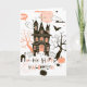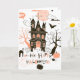 Perfeito para o Halloween! Este design bonitinho apresenta um motivo laranja e preto com uma casa assombrada, frente e centro, com duas árvores nuas em ambos os lados. Uma lua de cheio, com um fantasma dizendo BOO, um morcego, um jack o'lantern no gramado e um gato negro, todos acrescentam ao ambiente de Halloween.