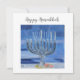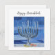 Pintura a óleo de uma menorá de Hanukkah com fundo azul.
