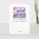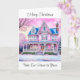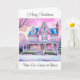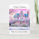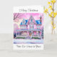 Um bonito cartão de Natal com uma casa vitoriana cor-de-rosa, um jardim de neve e uma saudação quente.