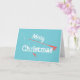 Cartão de Boas Festas de Pesca com Mosca. Cana de pesca com mosca, carretel e linha de pesca curva com isca de mosca. Feliz Natal em letras brancas. Fundo turquesa. Perfeito para pescadores de mosca, independentemente de se pescam truta ou robalo boca pequena nesta época de festas!