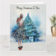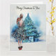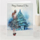 Cartão Feliz Natal, mulher e árvore de Natal azul
