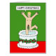 Um homem de desenho animado vestindo apenas um monte de conterrâneos, saltando de um bolo gigante dizendo 'Feliz Natal'.
