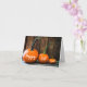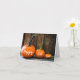 Este cartão rústico de Feliz Outono para Todos tem três abóboras laranja sentadas em frente a uma parede de madeira marrom escuro. Você também pode aumentar o tamanho do cartão para 5x7 ou um tamanho maior.