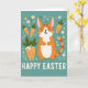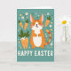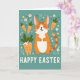 Concebido com uma doce cena primaveril, este cartão apresenta uma criatura estilizada semelhante a um gato com orelhas longas e pontiagudas como as de uma lebrezinha 🐰. Listras laranja envolvem seu corpo acima de uma barriga branca, e seus olhos fechados, bochechas rosadas e língua rosa minúscula lhe dão uma aparência terna e amigável. O fundo é um tom azul-esverdeado suave, criando um cenário calmo que faz os tons laranja quentes se destacarem. Ao redor do personagem, vários legumes de raiz laranja aparecem sozinhos ou em pequenos feixes, com suas folhas verdes inclinadas como se estivessem reunidos. Pequenas flores brancas e amarelas estão espalhadas pelo espaço azul-esverdeado, e alguns floreios brancos ondulados adicionam um movimento suave, como uma brisa através de um jardim 🌷. As formas têm uma aparência de papel recortado e sobreposto, o que adiciona profundidade suave sem parecer confuso. Ao longo da borda inferior,