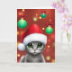 Um gato cinza giro vestindo um chapéu de Papai Noel cercado por Enfeites de natal verdes, criando um cartão festivo e alegre de "Feriados Mais Felizes".