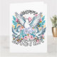 Felz pascoa! com uma imagem alegre e colorida de primavera, com pombos e flores.