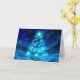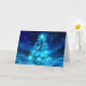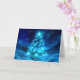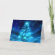 Cartão de Natal com uma árvore de Natal azul-elétrica moderna. Decorado com luzes ao redor. O fundo tem luzes desbotadas. Dentro de mensagem personalizada.