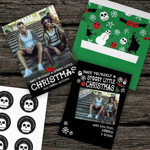 Este maravilhosamente assustador cartão de Natal oferece um estilo de gótico girando sobre os tradicionais motivos natalinos com flocos de neve e formas estelares formadas por ossos de esqueleto brancos, Enfeites de natal em forma de crânio e groselhas ocas, coroas pretas e árvores de Natal e ornamentos e bonecos de neve. Minhas ilustrações em vermelho, branco e verde são colocadas sobre um fundo preto. Meus gráficos acompanham o slogan TENHA UM PEQUENO NATAL SPOOKY, soletrado em um crânio branco angustiado e letras em forma de osso na frente desta placa. O dentro da placa está pronto para ser personalizado com sua própria saudação.
