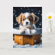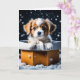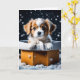 Cachorro de Natal adorável numa caixa de presentes de ouro. Cartão doce para qualquer amante de cachorro. Dentro, a mensagem no cartão pode ser personalizada.