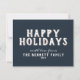 Cartão-postal de feriados felizes para a Tipografia Branca Simples Moderna. A tipografia branca tem um fundo azul marinho - personalize o nome da família e o ano. A parte de trás é marinho azul com manchas brancas.