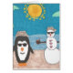 Um boneco de neve e um pinguim tiram férias para a praia.