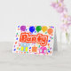 Um cartão de cumprimentos padrão, 5"x7", horizontal, dobrado, com um desenho/design da palavra = Festa, na cor vermelha e branca, com alguns balões coloridos, confetes e pacotes de presentes. = (Desenho/Design por P.J.M.)