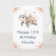 Um belo cartão de aniversário de festa de aniversário apresenta uma tartaruga com arranjos florais cor-de-rosa. Perfeito para uma festa de aniversário. As palavras podem ser alteradas para se adequarem aos seus próprios detalhes ou requisitos