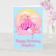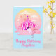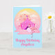 Cartão de aniversário do Flamingo do Carnaval da Diversão para seu convidado de honra especial. Meninas de todas as idades vão amar essa cena fofa com um flamingo rosa comendo algodão doce rosa fora dos terrenos da feira, com brinquedos do parque de diversões ao fundo. Texto personalizado na frente e dentro para que você possa tornar este design seu de qualquer maneira que desejar. Certifique-se de ver todos os suprimentos e decorações de festa correspondentes na loja!