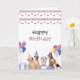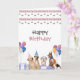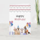 Filhotes bonitos com chapéus de aniversário, presentes e balões coloridos. A celebrante está sentada em um travesseiro roxo na frente do bolo. O fundo é branco