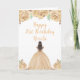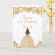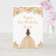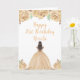 Este cartão de aniversário apresenta flores florais de creme de pêssego, falso brilho, e uma bela princesa de cabelo castanho e um vestido elegante. Isto é perfeito para uma festa de aniversário.
