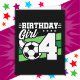 Esta design de festa de aniversário de futebol é perfeita para uma festa de aniversário de tema de futebol de 4 anos de idade para comemorar seu quarto aniversário! Excelente para crianças que adoram jogar futebol, assistir futebol ou futuros jogadores de futebol! Possui uma bola de futebol em um gráfico de campo de futebol com número 4 para o 4º aniversário de uma garota.