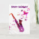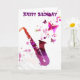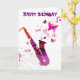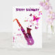 Um design bonito de um saxofone rosa e roxo com notas musicais e borboletas com a saudação de Feliz Aniversário. Esta design é perfeita para amantes da música em todo o mundo.
