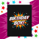 Este lindo desenho de aniversariante de herói de quadrinhos é perfeito para uma festa de aniversário com tema de super-herói! Ótimo para meninos de todas as idades que amam super-heróis de quadrinhos ou vilões com superpoderes! Apresenta a citação 'Aniversariante!' de feliz aniversário em um tema de super-herói de quadrinhos que o super aniversariante vai ADORAR!