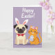 Designed with a soft lavender background, this card features two animated animal friends posed close together, their gentle body language suggesting easy friendship with a hint of romance. A light-furred dog sits low in the frame with wide-set eyes and a slightly wistful look, wearing a red bow tie and tall bunny ears lined in white and pink 🐰. Beside the dog stands an orange cat with a round, cheerful face, topped with small pink-and-white blossoms like a spring crown 🌷. The cat holds a decorated egg at chest level, patterned with neat blue-and-white stripes that draw the eye. Near the top, the words “Happy Easter!” appear in white lettering, centered and spaced above the characters for balance. The warm red bow tie and bright orange fur stand out against the cool purple backdrop, while the blossoms add a tender, affectionate touch between the two. Small highlights along the bunny ears, the egg stripes, and the flower petals give the scene a smooth, softly shaded finish.