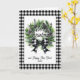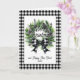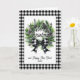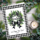 Elegant nostalgic watercolor black and white gingham check beribboned pine and berries holiday wreath "Merry Christmas" non-photo greeting design with coordinating back pattern design. All text is editable.
