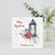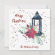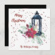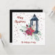 Festive Modern Christmas Card designed with a black lantern, bright red Poinsettia, green floral spray and red stars. The front text includes: Merry Christmas and your Family Name. The reverse text includes: Wishing you a Merry Christmas and A Happy New Year! surrounding a black lantern with a red cardinal, red poinsettia, green floral spray and red stars. To personalize, simply insert your family name into our easy template, replacing the sample text. This Christmas 2-sided card has a matching party invitation and party accessories.