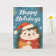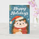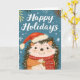 Compartilhe o espírito de Natal com este cartão de Natal impiedoso com um adorável ouriço fazendo um pequeno chapéu de Papai Noel! Contra um cenário azul sereno de inverno adornado com flocos de neve e folhagem sazonal, nosso ouriço festivo envia desejos calorosos a amigos e familiares. A mensagem sincera de "Feriados Felizes" acrescenta um toque extra de alegria a este cartão delicioso.