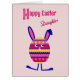 Esta é uma placa de Páscoa colorida que certamente encantará sua filha. O coelho da Páscoa tem a forma e decoração de um ovo de Páscoa, com listras coloridas, manchas e ziguezags em tons de rosa, amarelo e azul, e o fundo do cartão é rosa claro. A mensagem dentro pode ser personalizada, ou você pode usar a saudação desde que "Um coelho felz pascoa está aqui para desejar a uma filha especial um Felz pascoa muito grande!"