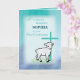 Um doce cartão de primeira confissão com um fundo colorido. Uma ovelha está em frente a uma cruz. Mande bênçãos enquanto você personaliza este cartão com o nome da sua filha enquanto ela faz sua primeira confissão na fé católica.