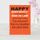O filho prova o bom gosto da filha, diz a frente deste cartão de aniversário engraçado. O cartão foi feito com uma mãe em mente que deseja provocar o marido de sua filha enquanto celebra a velhice em um ano. A mensagem bonitinha na dentro mostra o doce elogio na frente em uma jaqueta sorrateira, mas chocante e humorística que fará o marido da filha rir em voz alta.