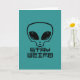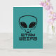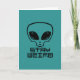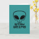 Ilustração da cabeça de alienígena de desenho animado com grandes olhos escuros com letras "Fique estranho". Palavras-chave: alienígena, espaço, marciano, desenho animado, humor, vetor, ficção científica, ficar, estranho
