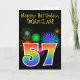A frente deste design de carta de saudação de aniversário vibrante e divertida apresenta um padrão colorido inspirado em fogos de artifício celebratórios, juntamente com o número "57", tendo um padrão de gradação inspirado no arco-íris multicolor, num fundo de cor preta. A frente também apresenta uma mensagem de saudação de aniversário, incluindo um nome de destinatário personalizado. O dentro apresenta uma mensagem de saudação de aniversário personalizável, ou talvez possa ser apagado e deixado o vazio se uma mensagem for escrita manualmente. Um cartão de aniversário personalizável como este pode ser uma maneira divertida de enviar desejos de aniversário a alguém que comemora seus cinquenta e sete anos. [~Z0000330]