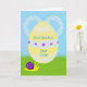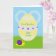 This design shows a large pale yellow egg shape centered on the front, covered in soft pastel patterns like light purple diamonds, calm blue crosshatching, and tiny white dots that add gentle texture. It sits on a bright green grassy ground with a light blue sky behind it, giving the scene an outdoor springtime feel 🌷. Near the top of the egg, two curved bands of white and light blue dots arc upward like decorative ears, adding a sweet, affectionate silhouette. In the lower left corner, a simple little creature with a sunny yellow body, shiny black eyes, and a small red smile leans toward the egg with a fond, friendly look 🐰. Its curled purple shell and small antennae guide your eye back to the center, as if it’s quietly admiring the special display. The main message is placed across the middle of the egg in turquoise lettering and reads, “Great Grandson’s First Easter.” The dotted arcs above the egg are evenly spaced in white and pale blue, standing out clearly against the sky.