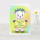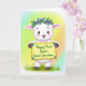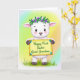 This card shows a young, human-like lamb facing forward, with soft white fleece and a gentle pink blush on its cheeks that adds a sweet, affectionate tone. A small spring wreath sits on its head, made of green leaves and tiny purple flowers, and it feels like a tender gift from family to family 🌷. The lamb’s dark, shiny eyes and calm little smile suggest a close bond, like it’s proudly sharing a special moment with someone it loves. Held in its front hooves is a bright yellow rectangle sign with a golden-brown border, and tiny blue flowers decorate the two top corners. The message is centered on the sign in green lettering and reads, “Happy First Easter Great Grandson.” Behind the character, the background fades through soft pastel shades from mint green into sunny yellow with a touch of pale orange, like early morning light. Along the bottom edge, a few simple green grass blades are scattered beneath the lamb 🐰.