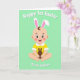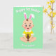 This card shows a stylized baby centered on a smooth mint-green background, smiling with rosy cheeks and wide dark eyes that feel warmly directed at someone special 🌷. The baby wears tall white bunny ears with soft pink inner panels, adding a sweet springtime touch 🐰. A sunny yellow romper with a white rounded collar and rolled cuffs gives the outfit a neat, cuddly look. Small hands hold a dark, bunny-shaped treat close to the chest, like a tiny gift meant to be shared. The illustration uses flat shapes with light shading, keeping the scene simple while still showing gentle depth. White raised-style lettering sits above and below the baby, with soft shadows, and the message includes a “first” milestone plus a short dedication in the same white text. The mint background stays unpatterned, while the pink ear centers and bright yellow outfit stand out clearly against the pastel field.