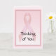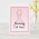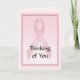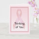 Uma ilustração gráfica de uma fita de sensibilização para o cancer da mama cor-de-rosa, apresentada pelo artista/designer Charmaine Paulson num cartão de saudação. O cartão tem texto (personalizável) "Pensando em você" na frente e modelos para o seu dentro de texto. ©2012