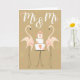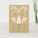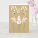 Uma design de casamento na moda divertida com um toque retrógrado. Um par de flamingos de pêssego fica em ambos os lados de um bolo de casamento com corações de pêssego, confete, anéis de ouro e curvas contra um fundo de troca de cor marrom neutro. Um design personalizável para você personalizar com seu próprio texto, imagens e ideias. Uma imagem de arte digital original.