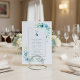 Este elegante cartão de número de tabela apresenta uma borda floral com estilo aquoso azul macio e uma lista de nomes fácil de ler numa letra serif para uma aparência de casamento romântica refinada. Inclui espaço para a lista de nomes de convidados abaixo do número da tabela, fazer-o perfeito para o gráfico de assentos ou para a mesa de recepção. Par com menus correspondentes e placas de lugar na mesma paleta para criar uma capa coesa através de toda a recepção.