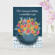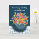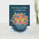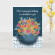 Give this vibrant bouquet of pink, orange and yellow flowers in a navy blue mug as a birthday present. The full bunch of watercolor florals stand out against a textured navy blue background and unique tablecloth. The words, "Here's hoping your birthday is as beautiful as you!" The inside message says, "Happy Birthday!".