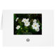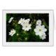 Uma fotografia de flores brancas do cosmos, parecendo um pequeno cosmos de estrelas entre as folhas. A placa foi deixada no dentro do vazio, mas pode ser mais personalizada.