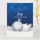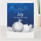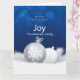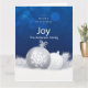 Celebre seu Natal de inverno em estilo com este festivo design azul e branco com bolas de prata e árvore branca com um padrão de flocos de neve descansando em neve fresca. As palavras "Feliz Natal" e Joy aparecem acima das decorações e um livro azul é visto no fundo. Personalize a saudação de dentro para atender seu cartões de natal ou mensagem aos amigos e à família.