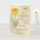 Um cartão com uma flor de tulipa na frente que oferece condolências e apoio ao marido enlutado na memória do primeiro aniversario de sua esposa depois de falecer.